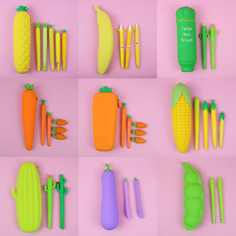 韩国创意果蔬胡萝卜软硅胶笔袋可爱学生文具套装仙人掌菠萝中性笔