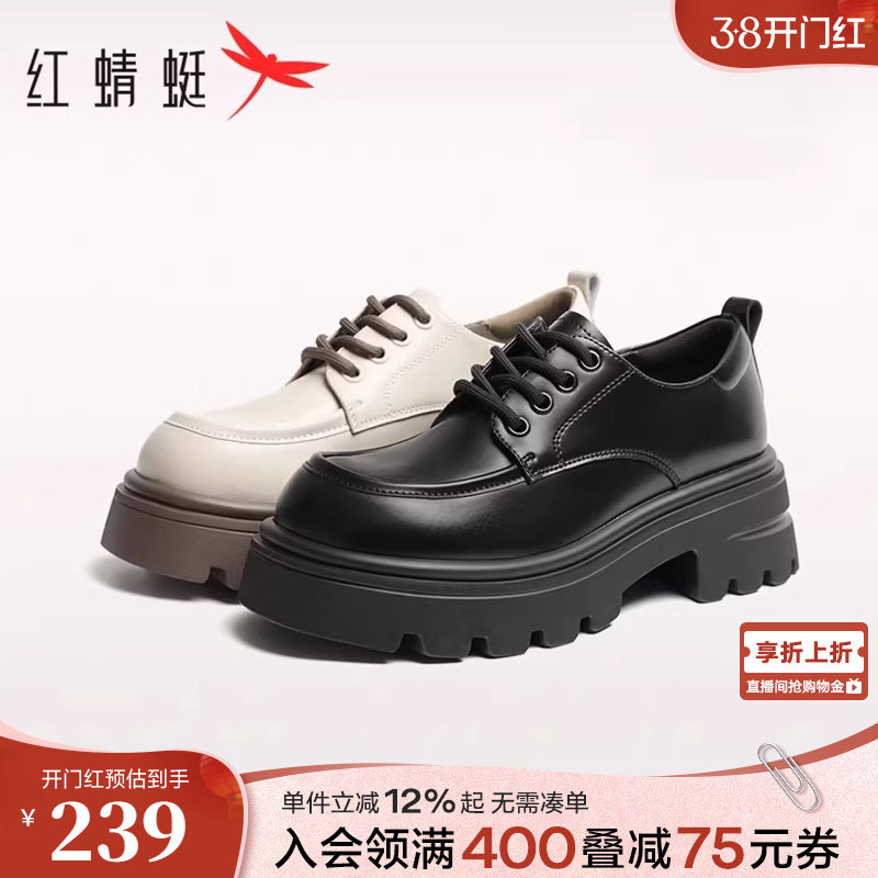 红蜻蜓厚底乐福鞋女春季新款女鞋黑色英伦风皮鞋女款白色增高鞋子