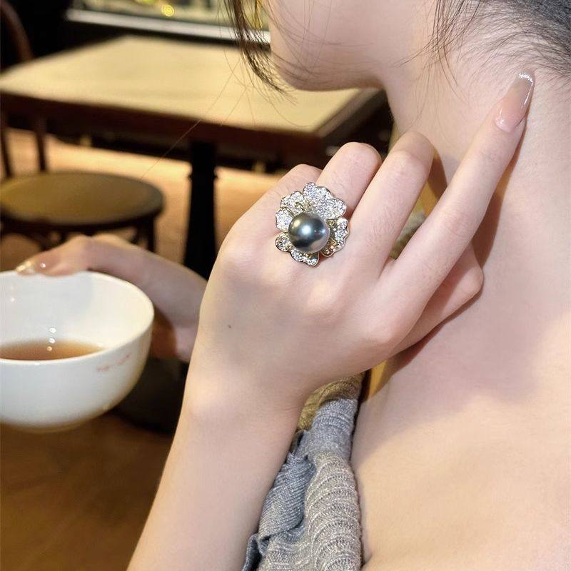 欧美复古宫廷风锆石灰色珍珠花朵夸张戒指女款气质个性食指戒指环