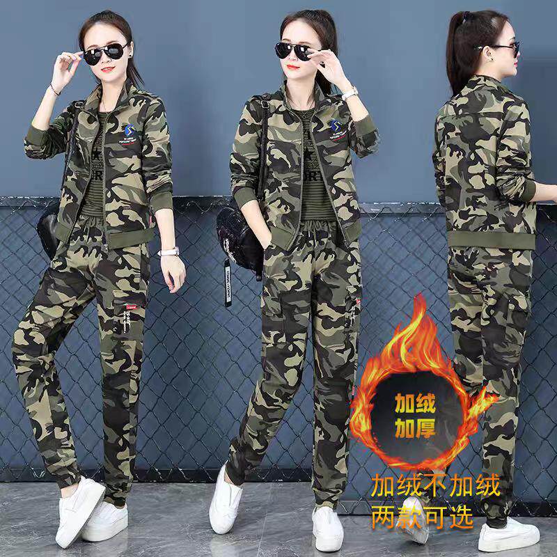 迷彩服套装女春秋冬新款时尚加绒休闲宽松显瘦水兵舞服运动三件套