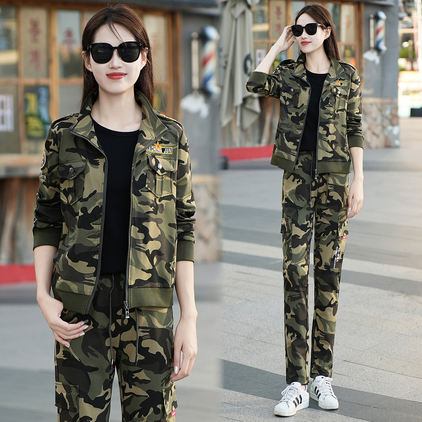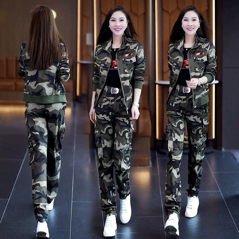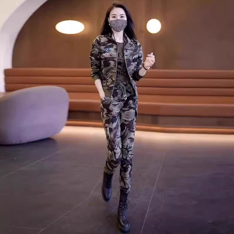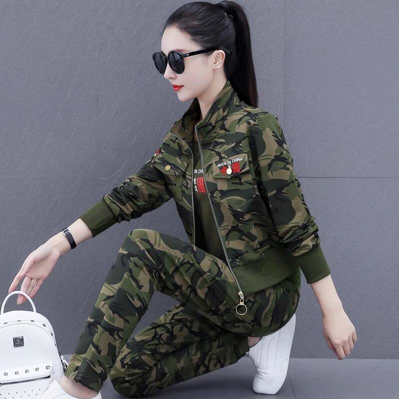微乐美迷彩服套装女三件套工装裤女秋束脚外套显瘦休闲运动两件套