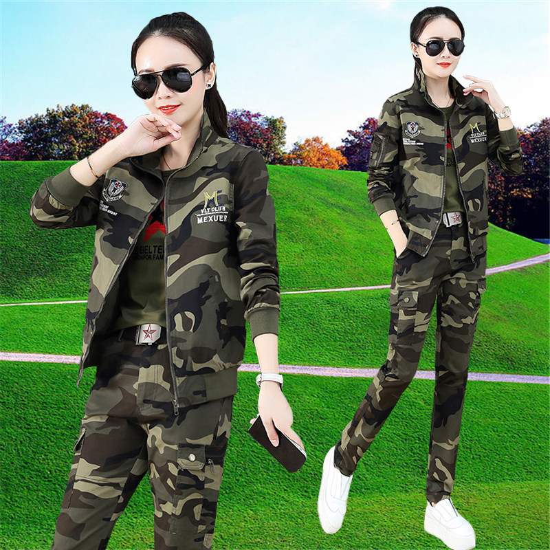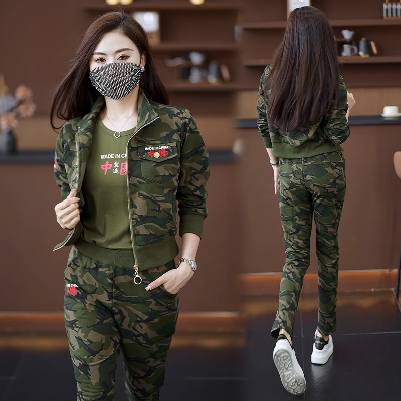 迷彩服套装女春秋新款大码工装时尚显瘦女士户外运动休闲三件套潮