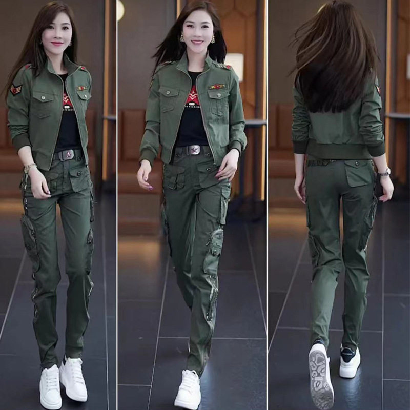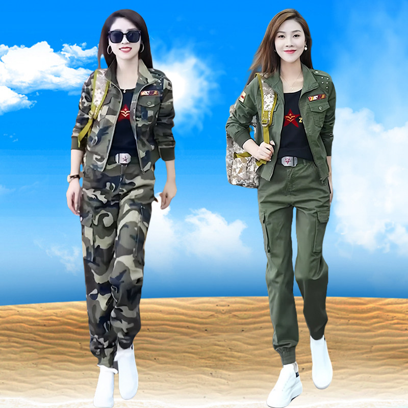 迷彩服套装女装春秋新款外套工装长裤运动两件套军绿色户外三件套