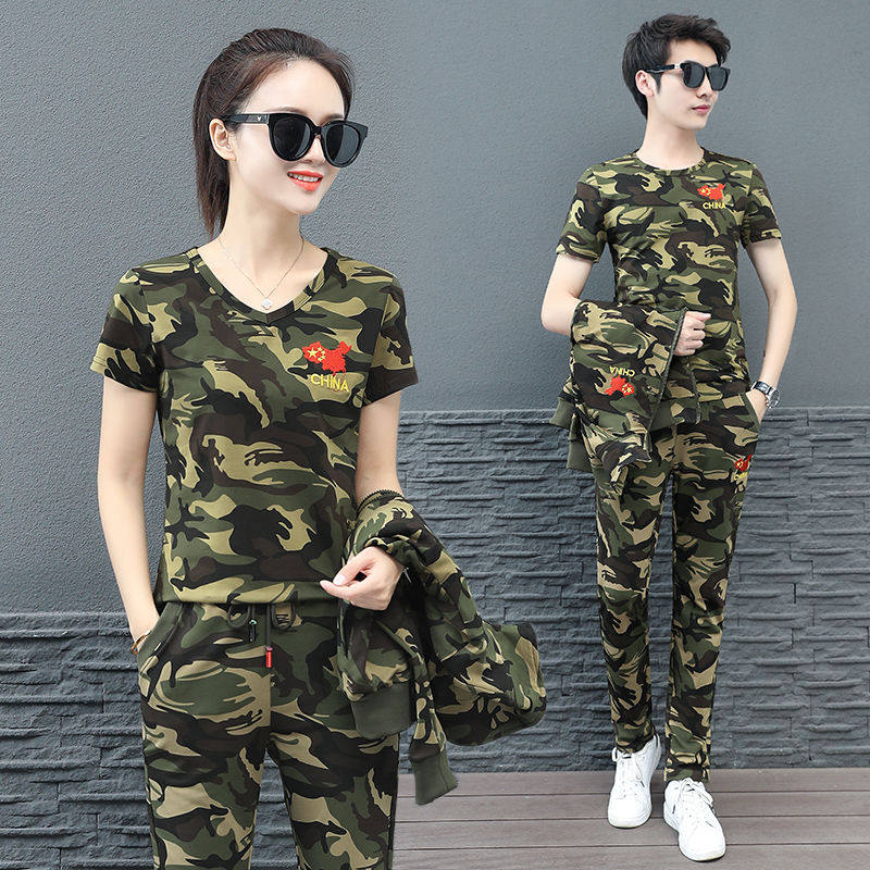 迷彩服套装三件套男女夏新款户外休闲弹力松紧腰广场舞运动俩件套