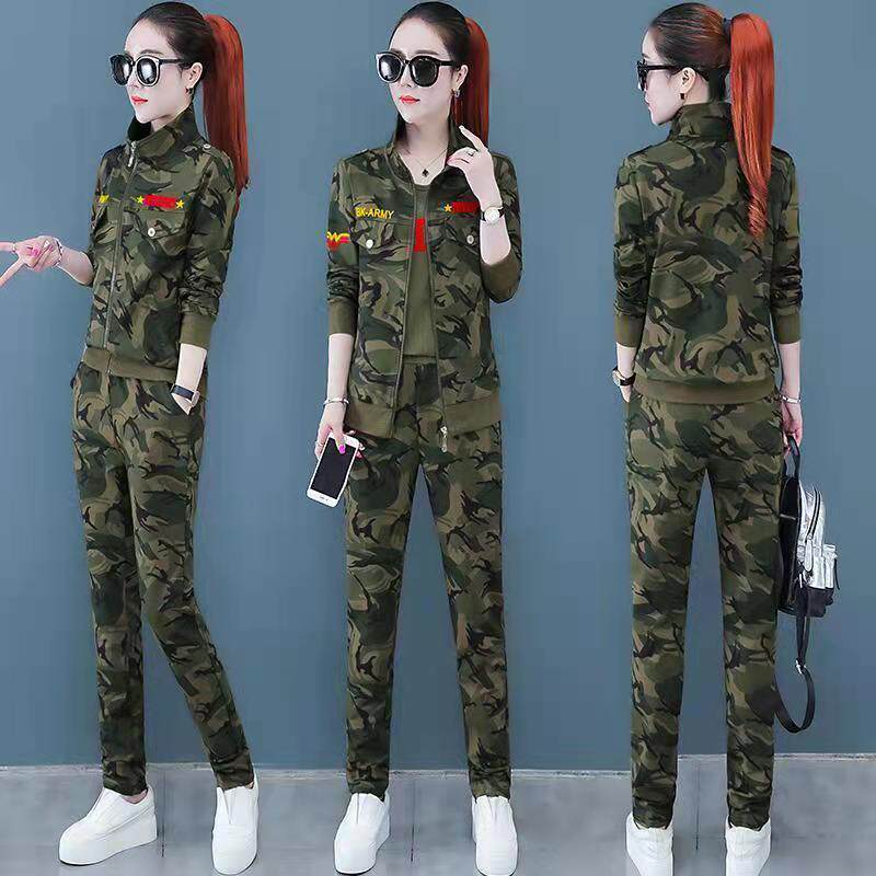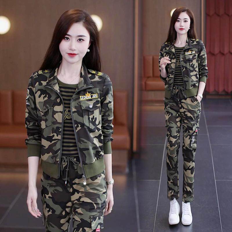 迷彩服套装女装春秋韩版显瘦军绿运动服三件套修身弹力两件套装女