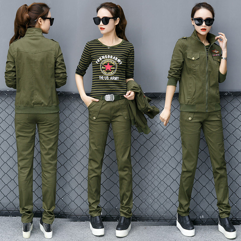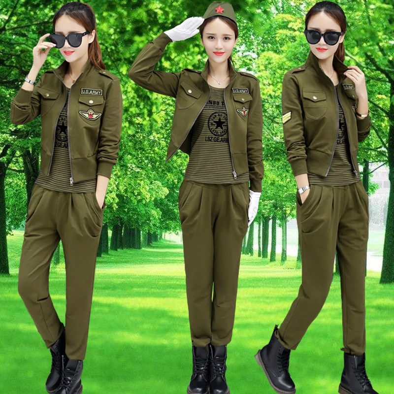 迷彩服三件套装女春装2019新款户外女装军装外套水兵舞蹈服演出服