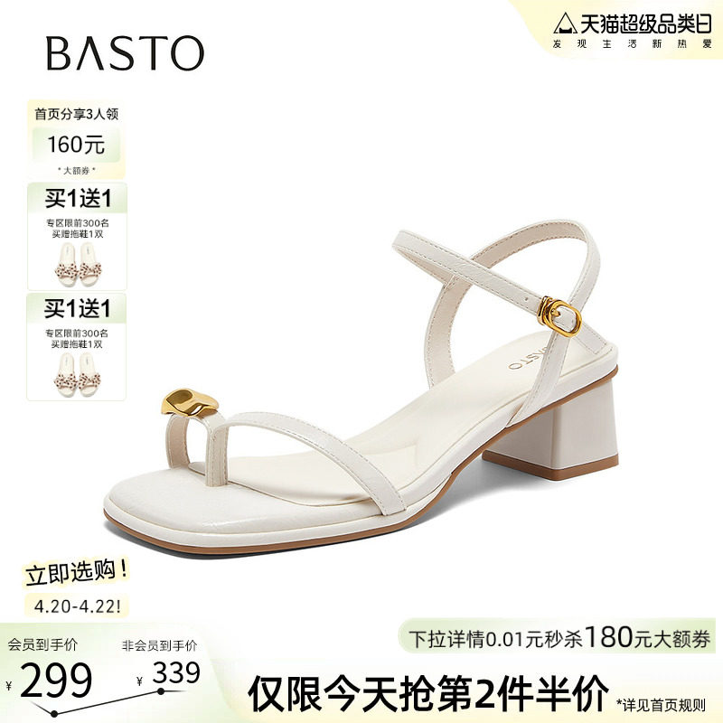 百思图2026夏季新款时尚一字带夹趾凉鞋粗跟方头女凉鞋F2055BL6