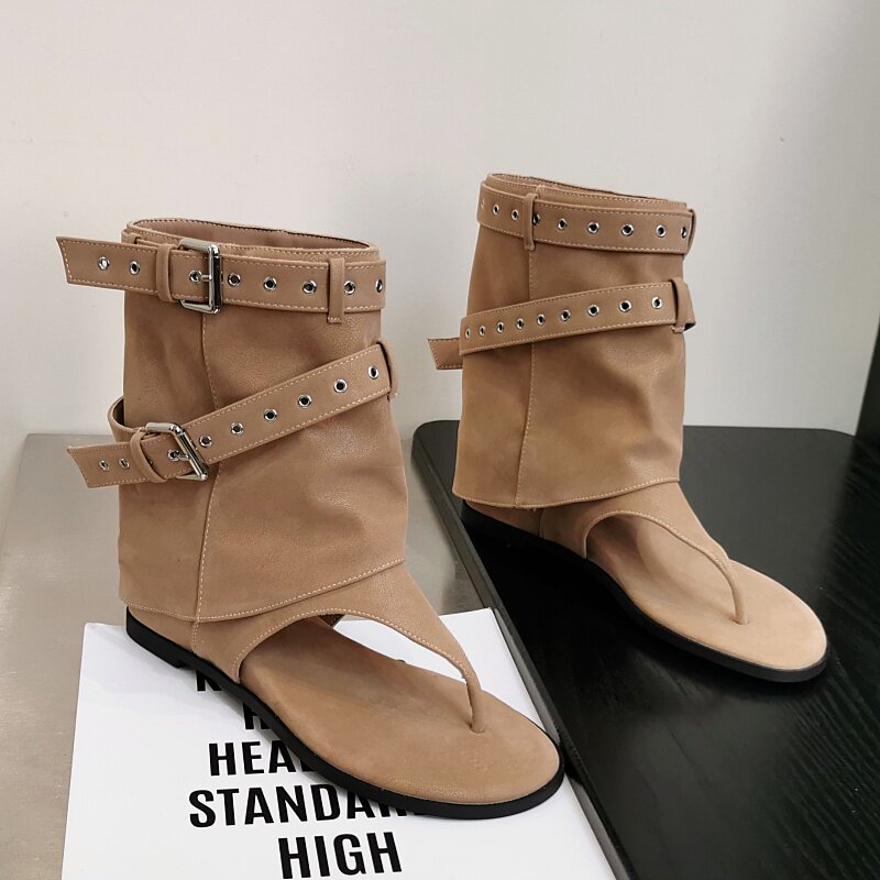 复古辣妹夹趾凉靴女夏2026年新款带皮带扣镂空罗马靴显瘦平底凉鞋