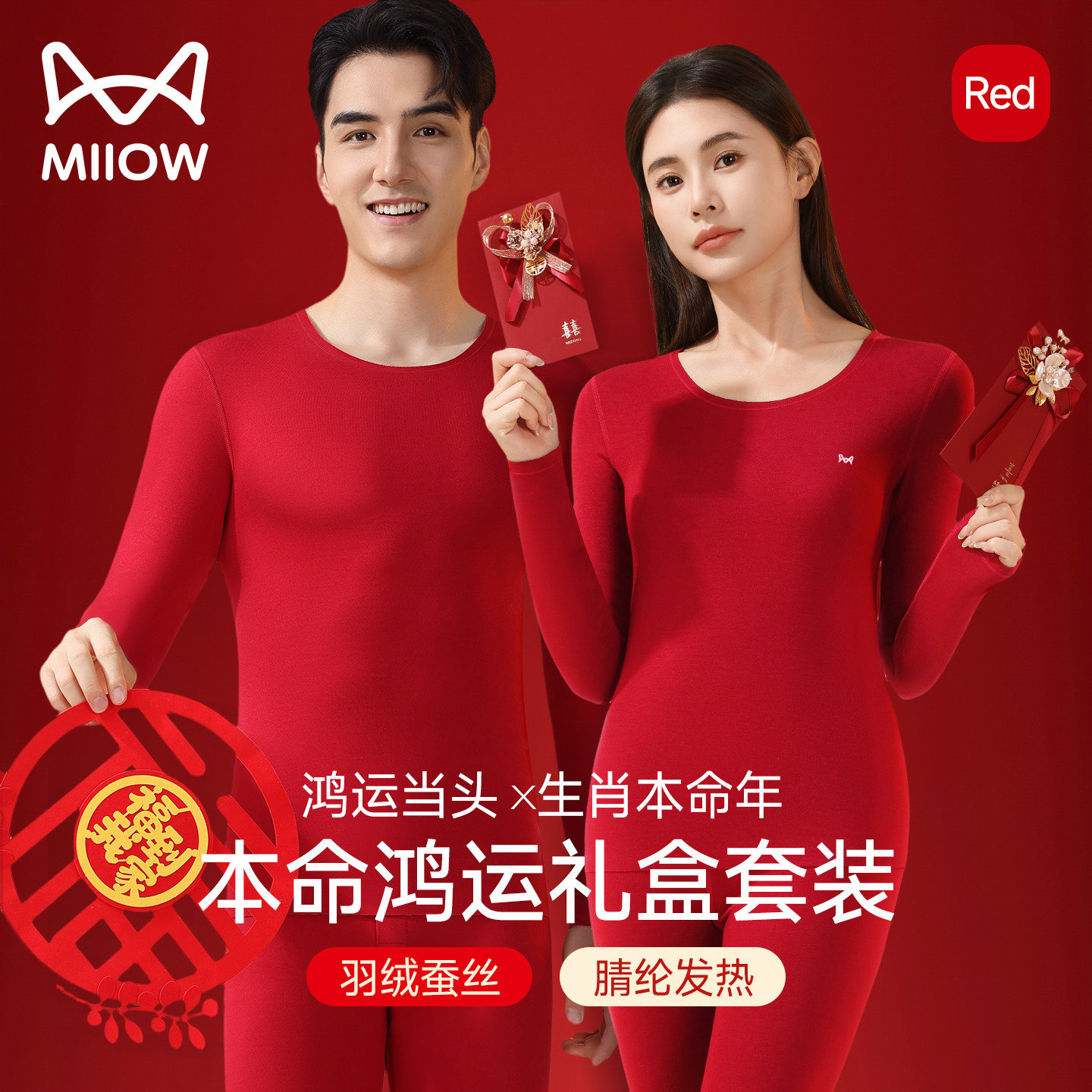 猫人本命年红色保暖内衣套装男士纯棉马年结婚打底秋衣秋裤男女款