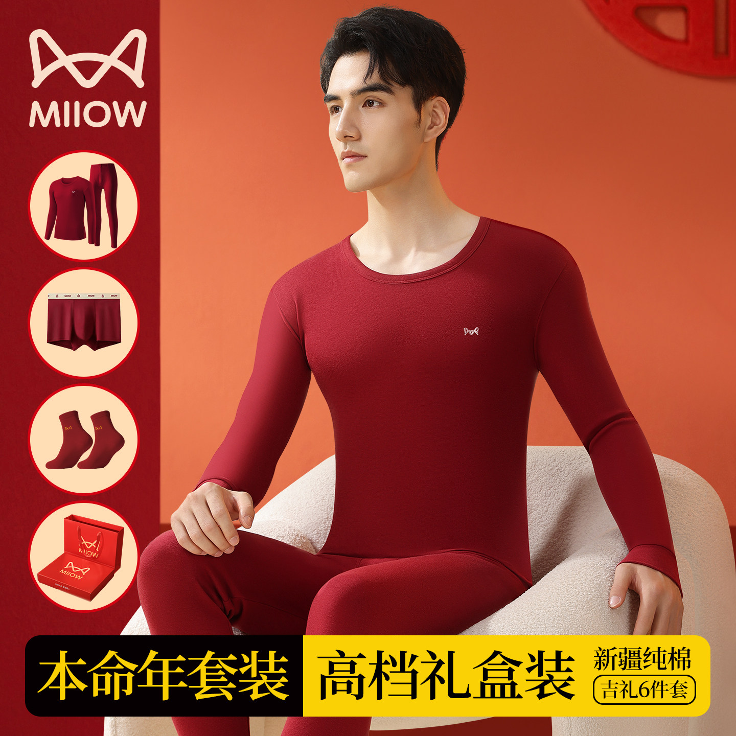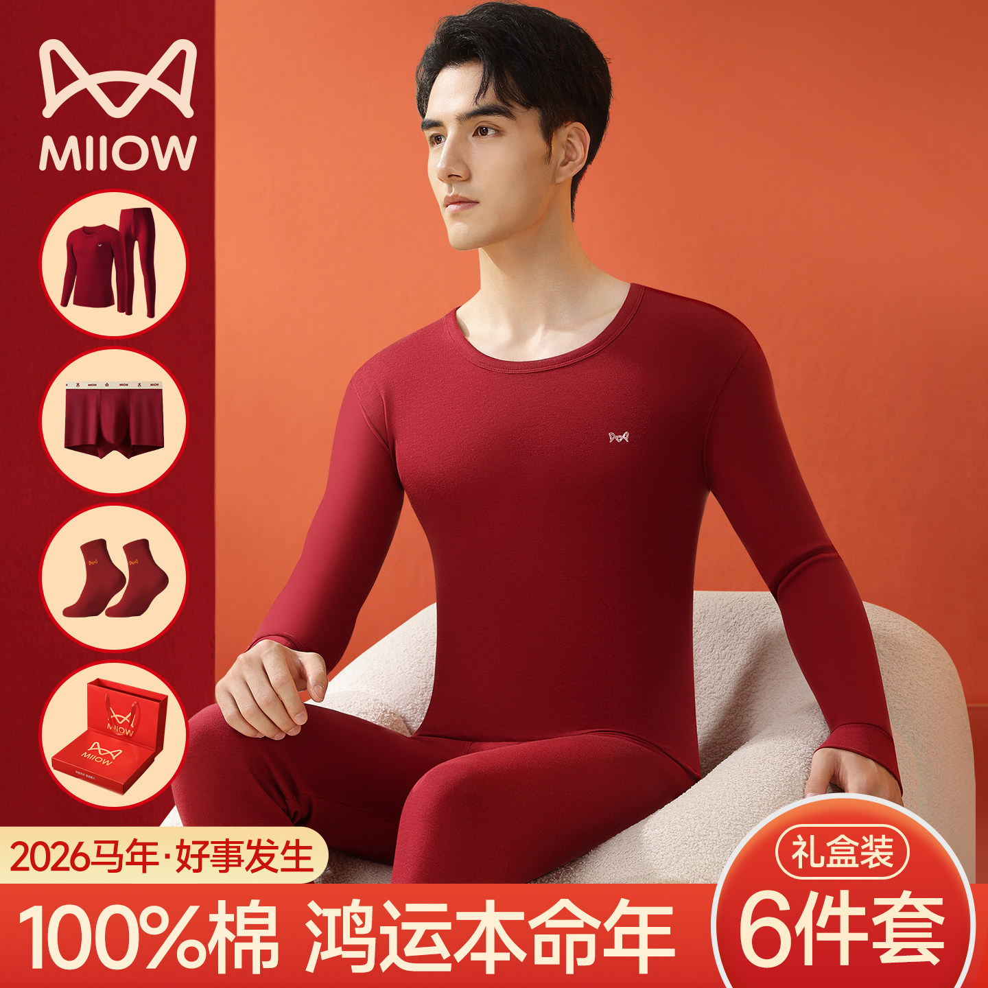 猫人本命年保暖内衣套装男士纯棉酒红色2026马年结婚打底秋衣秋裤