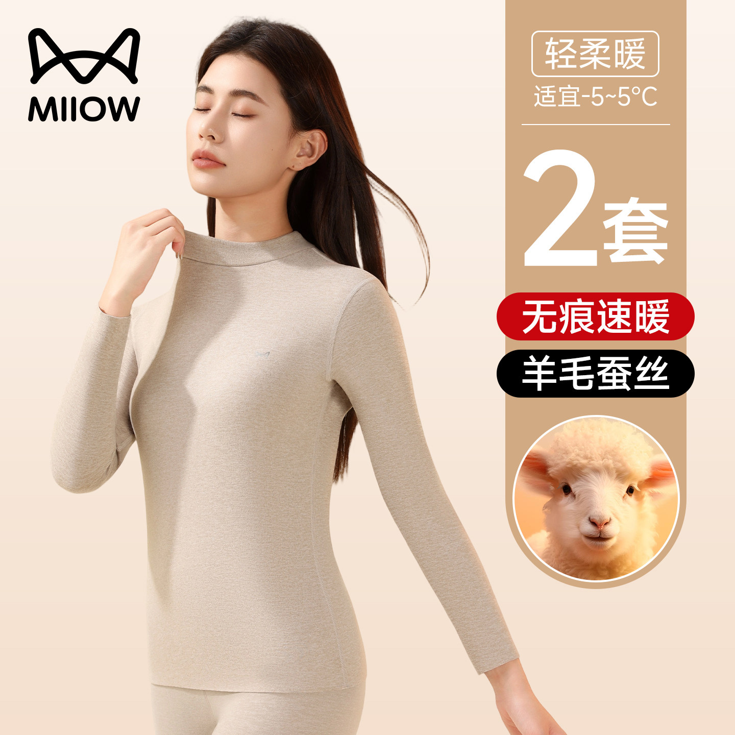 猫人中高领保暖内衣女款秋冬季羊毛蚕丝防寒打底秋衣秋裤女士套装