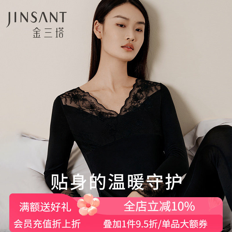 金三塔真丝保暖内衣套装女100%桑蚕丝V领薄款蕾丝打底秋衣秋裤