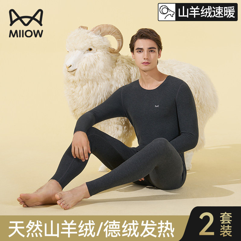 猫人保暖内衣男款加绒德绒发热羊绒蚕丝打底秋衣秋裤加厚男士套装