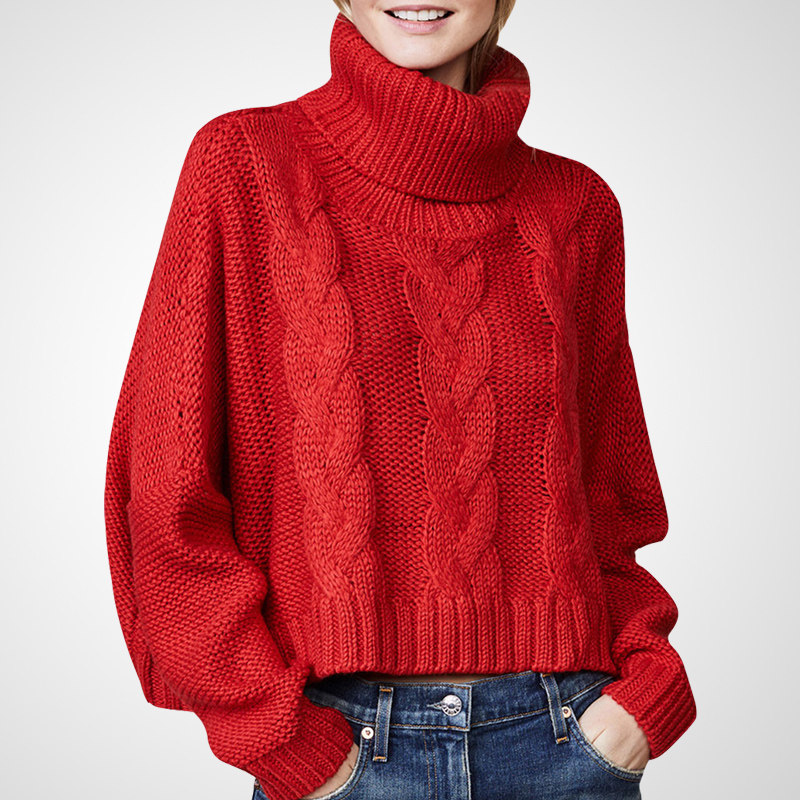 棉线麻花红色高领毛衣女套头短款加绒加厚针织宽松慵懒风打底秋冬