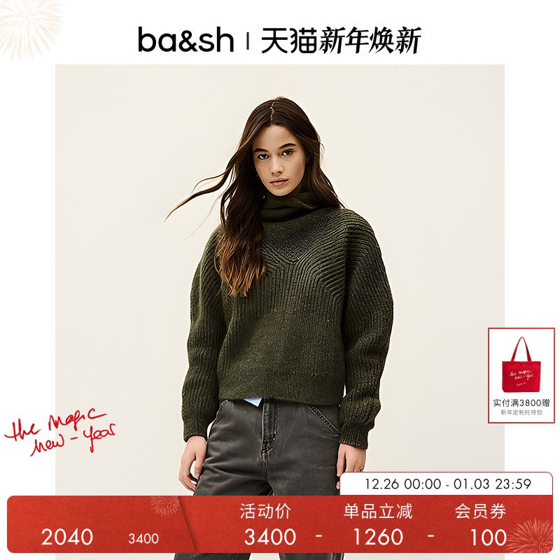 bash2025新款冬季休闲复古纯色高领毛衣女套头针织衫上衣1H25ROUM