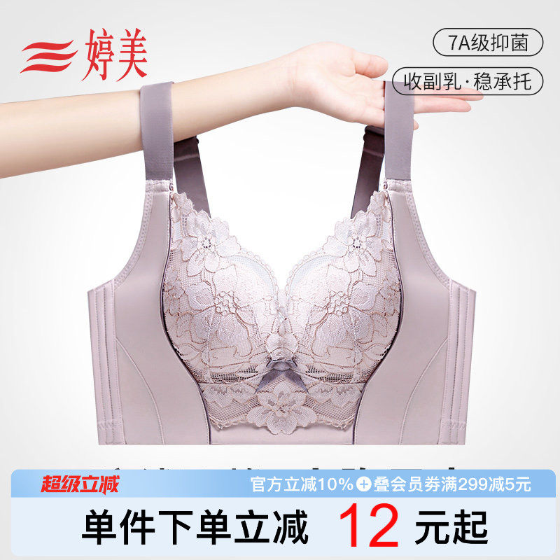 婷美2026夏薄款大胸显小文胸兔耳杯提拉防垂调整型收副乳蕾丝内衣