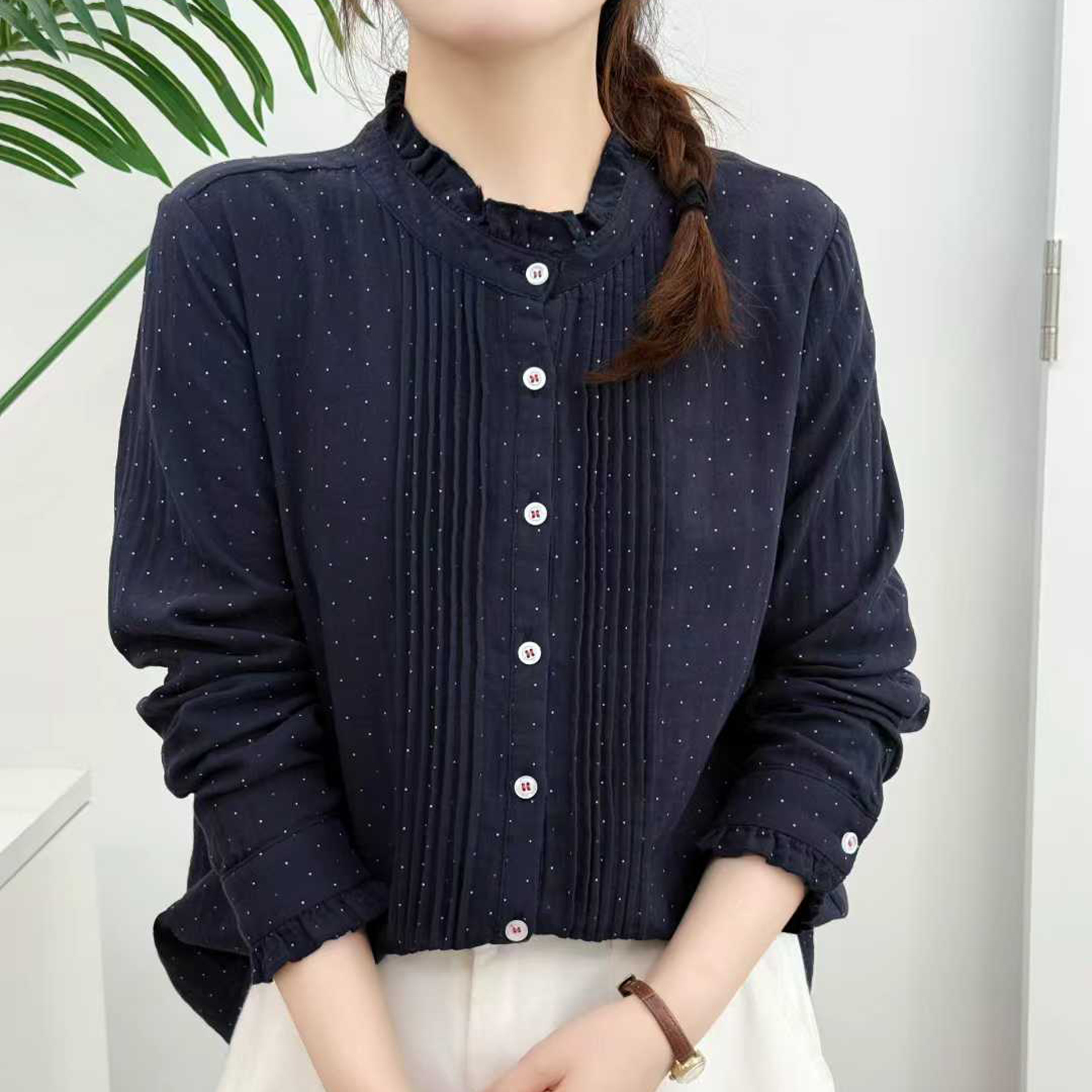 秋季新款小清新文艺全棉双层棉纱衬衫女长袖柔软舒适波点印花衬衣