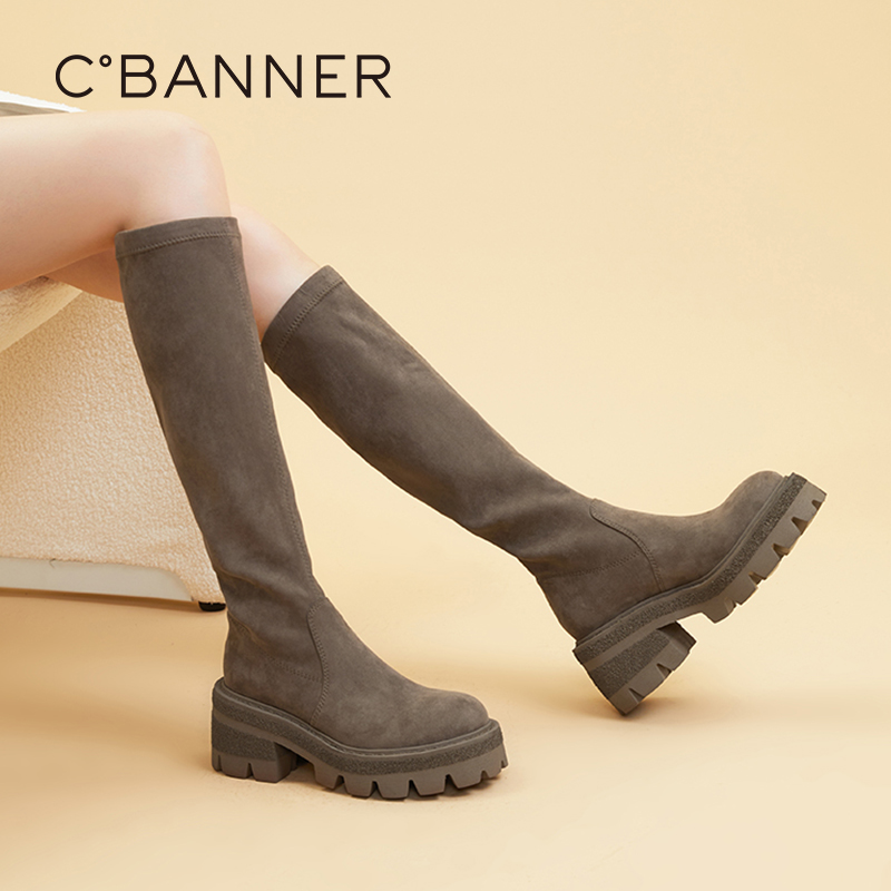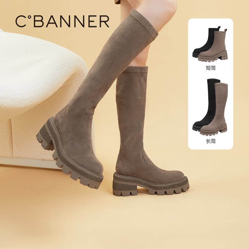 千百度女鞋冬季新款弹力靴/袜靴超轻丝绒弹力靴高筒长靴粗跟靴子