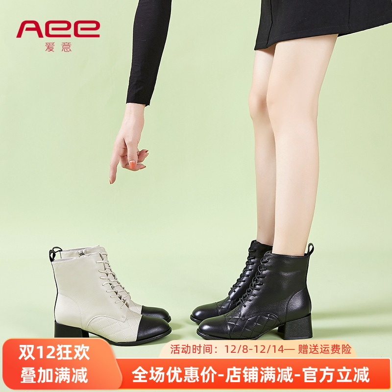 Aee/爱意短靴女侧拉链中跟新款秋冬马丁靴女ins潮牛皮粗跟靴