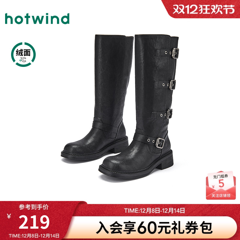 热风黑色骑士靴女鞋2025年冬季新款时尚百搭长靴户外酷帅粗跟靴子