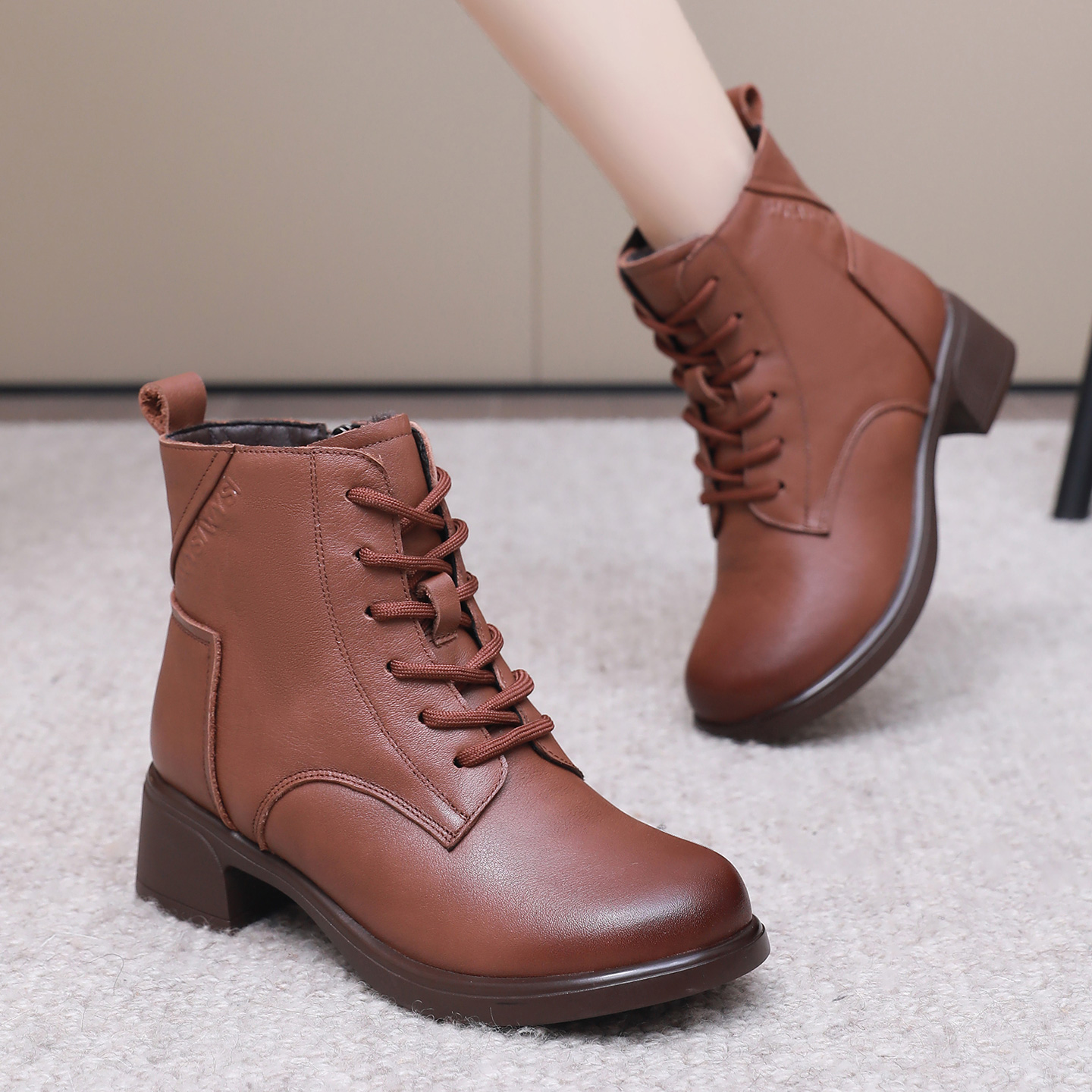 真皮马丁靴女秋冬短靴粗跟靴子中年防滑妈妈鞋冬季加绒保暖棉靴子