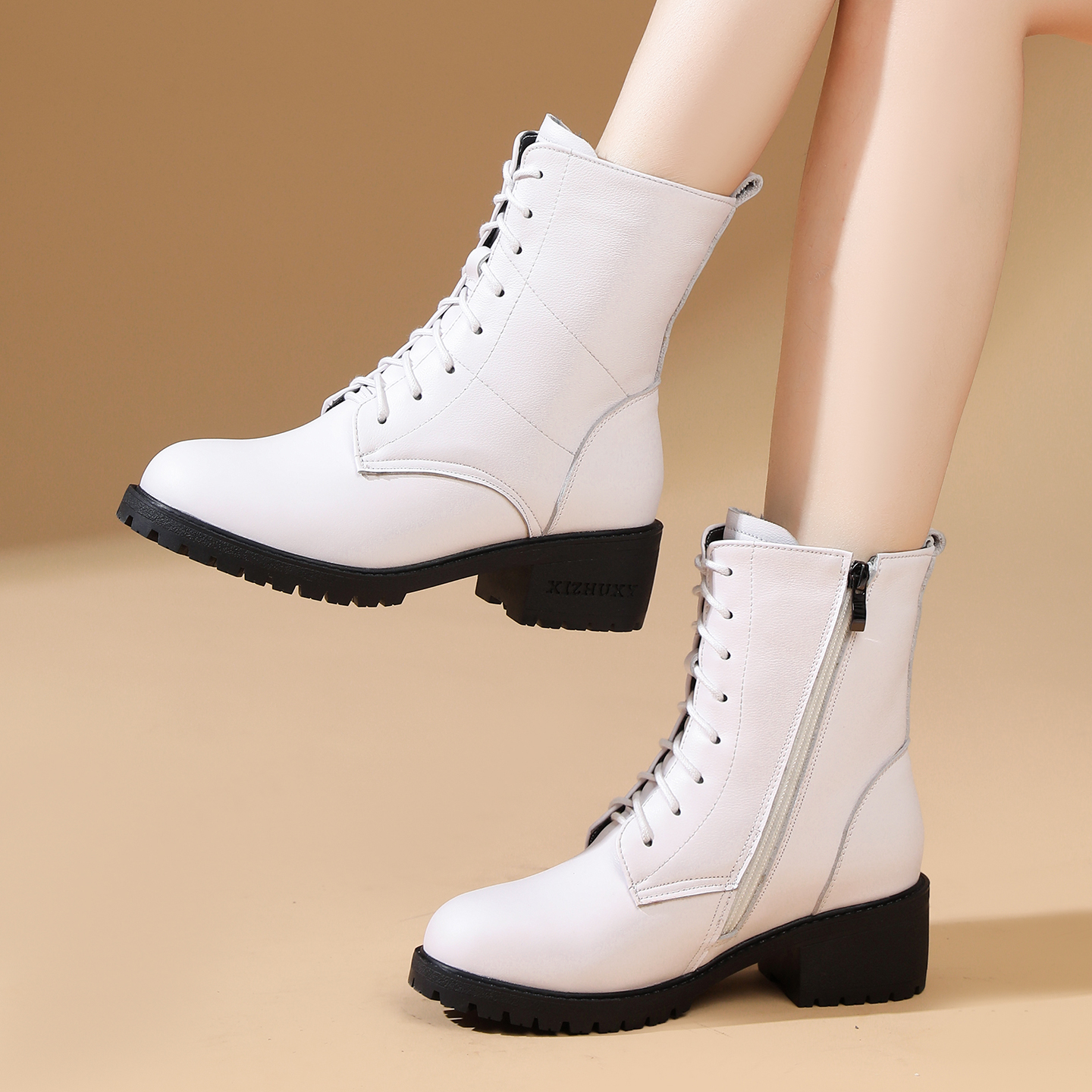 真皮马丁靴女春秋单靴中跟短靴粗跟靴子舒适冬季软底加绒妈妈棉靴