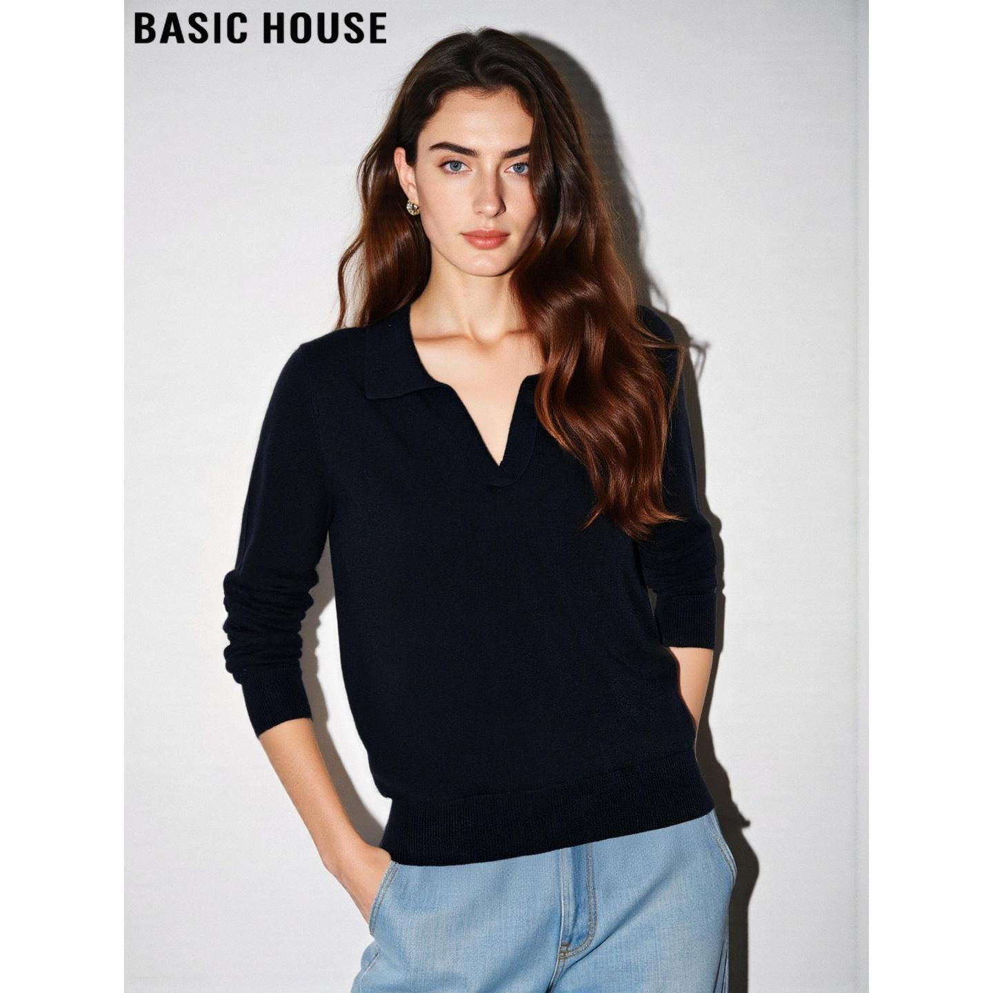 Basic House/百家好黑色翻领天丝针织衫女春季美式复古V领打底衫
