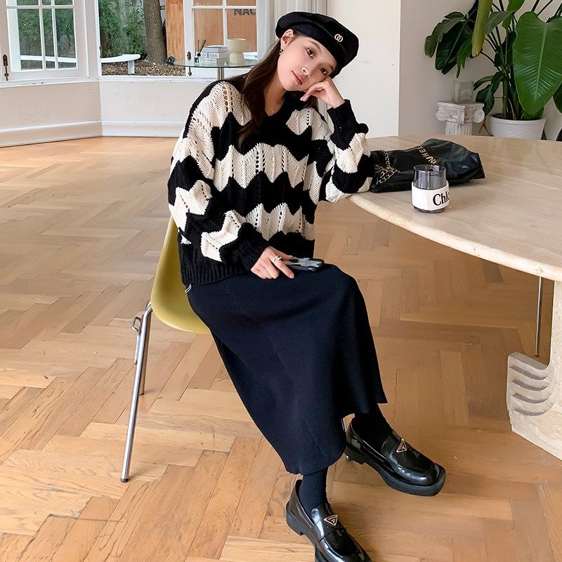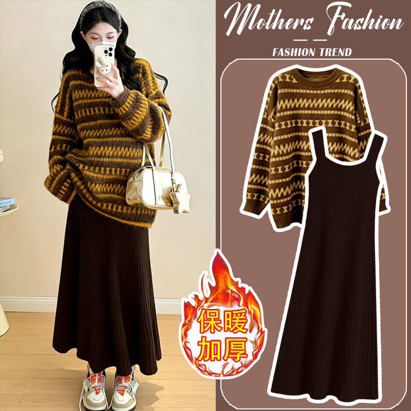 孕妇针织套头毛i衣宽松连衣裙2021时尚韩版潮妈吊带裙毛衣两件套
