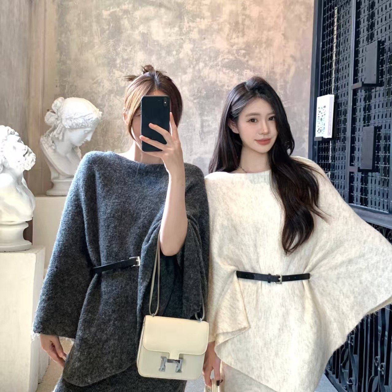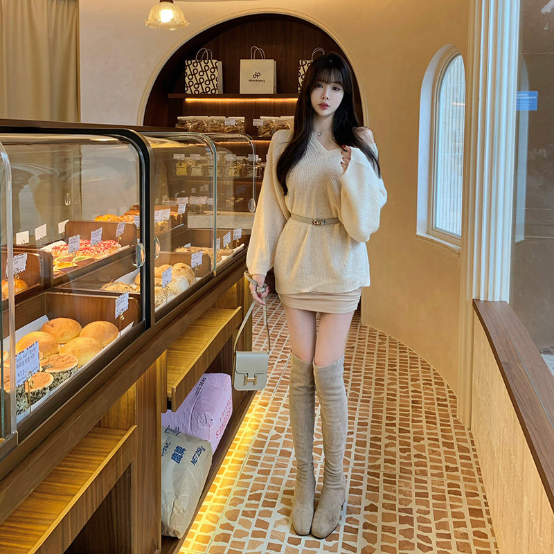韩版露肩慵懒风披肩毛衣女+高级感气质内搭吊带裙两件套配腰带潮