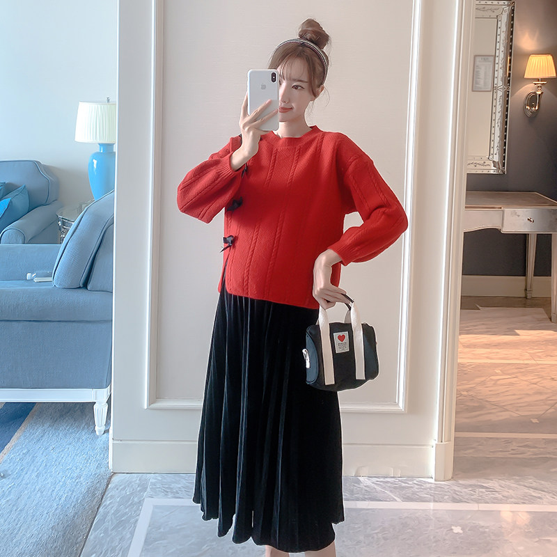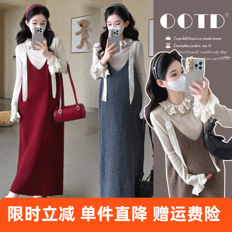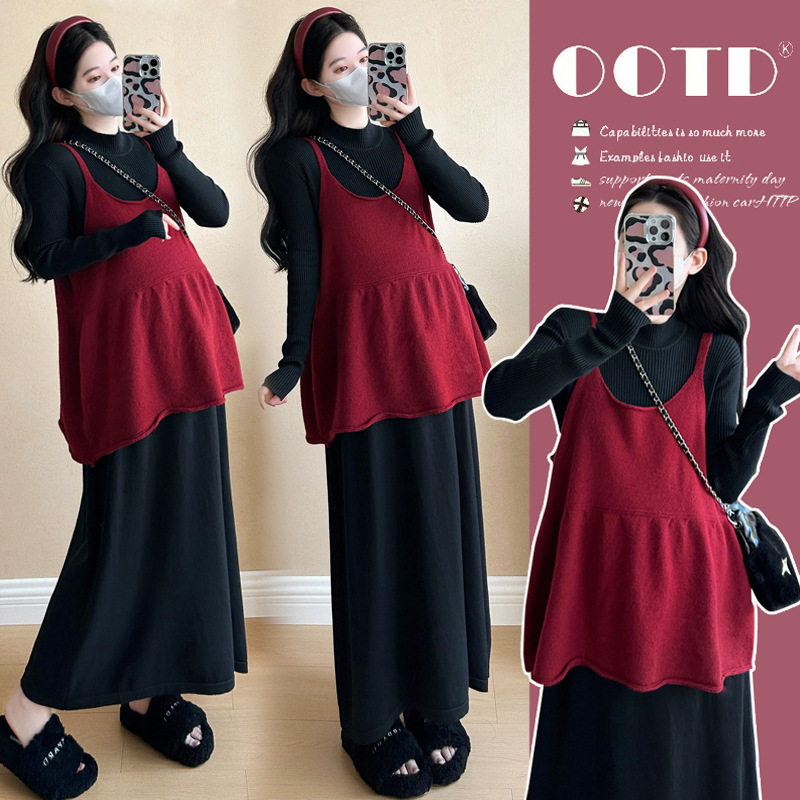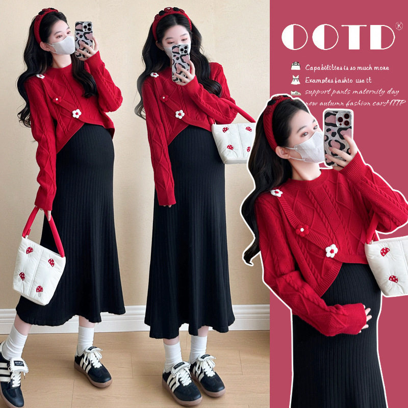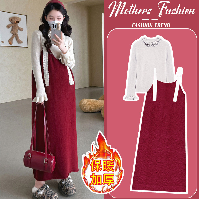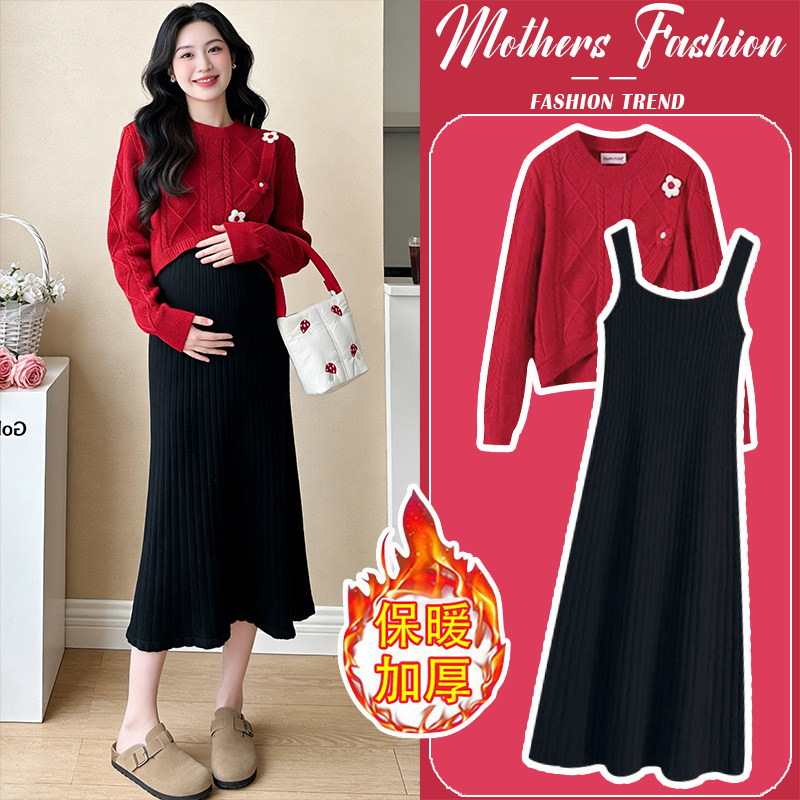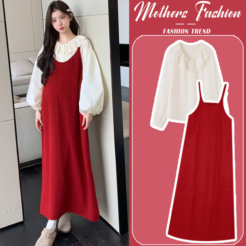 孕妇连衣裙套装春秋冬2026新款韩版红色针织毛衣吊带裙衬衣两件套