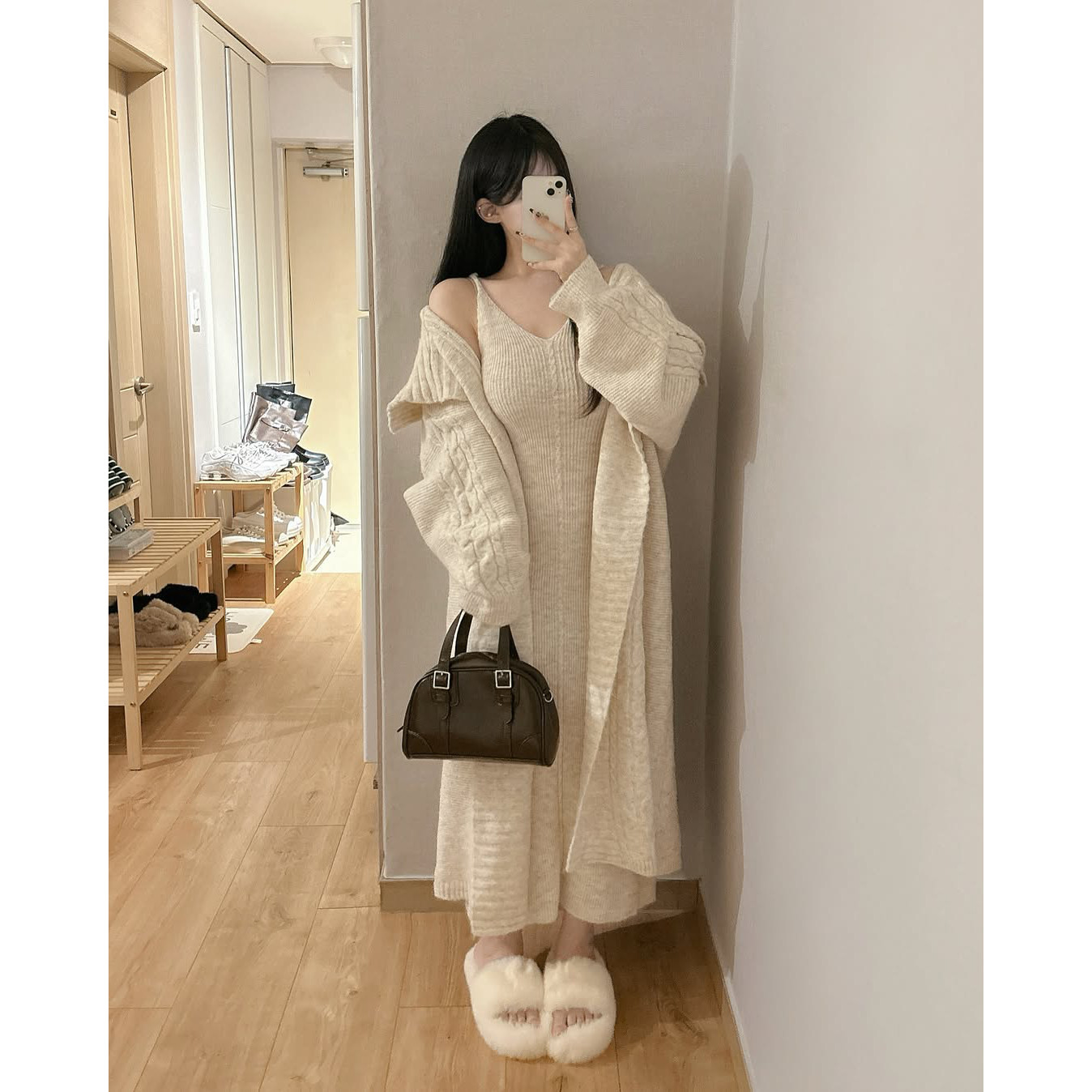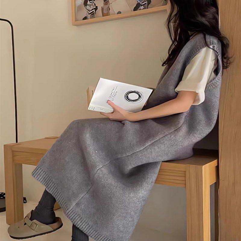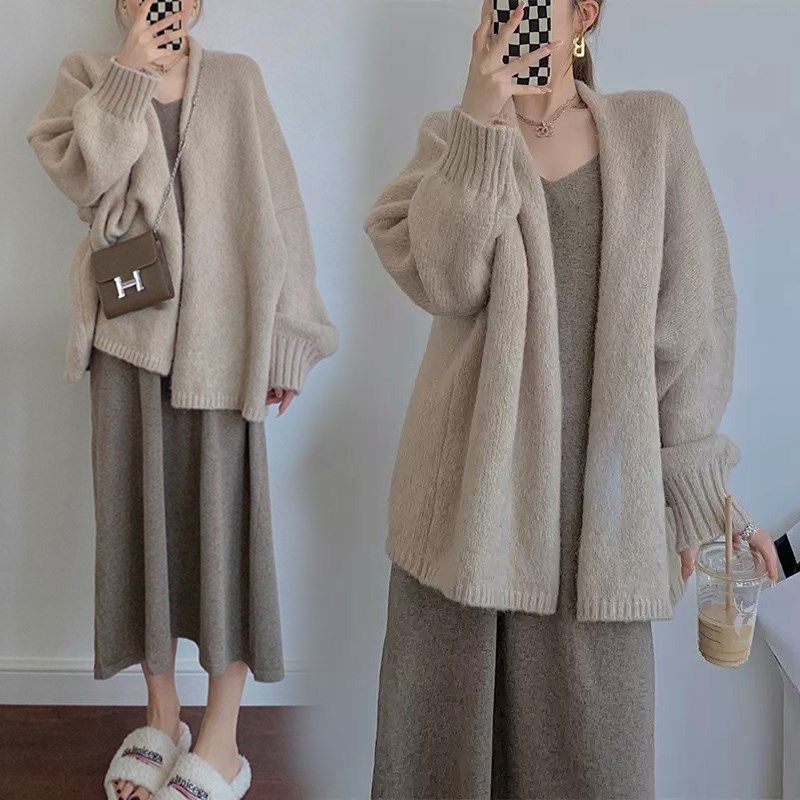 长款毛衣外套女秋冬温柔风韩版秋装加厚开衫两件套吊带针织连衣裙
