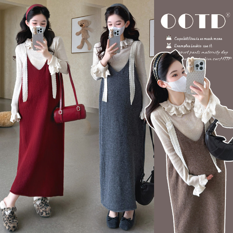 2025秋冬新款孕妇韩版毛衣蕾丝大码女装吊带背心裙花边打底衣套装
