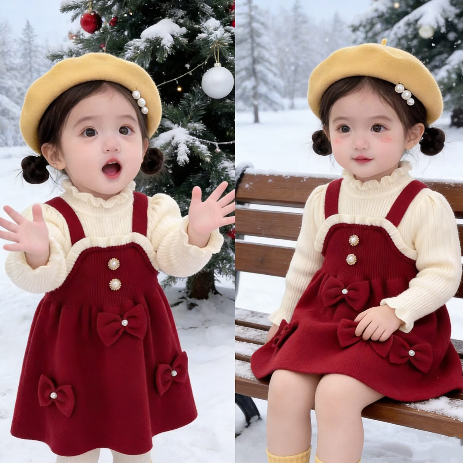 女童毛衣连衣裙三个蝴蝶结假两件吊带针织毛衣裙秋冬新款女宝韩版