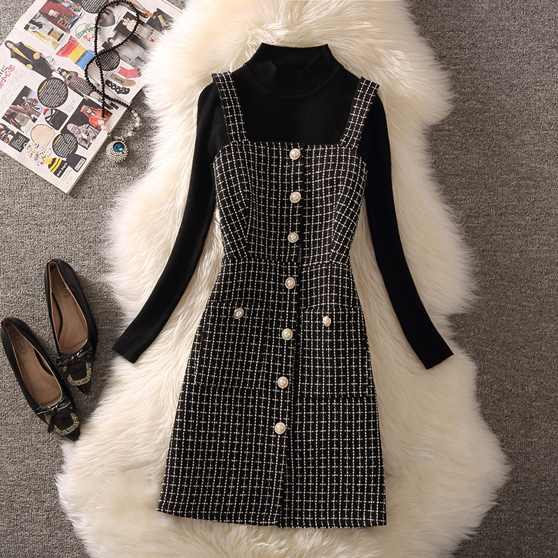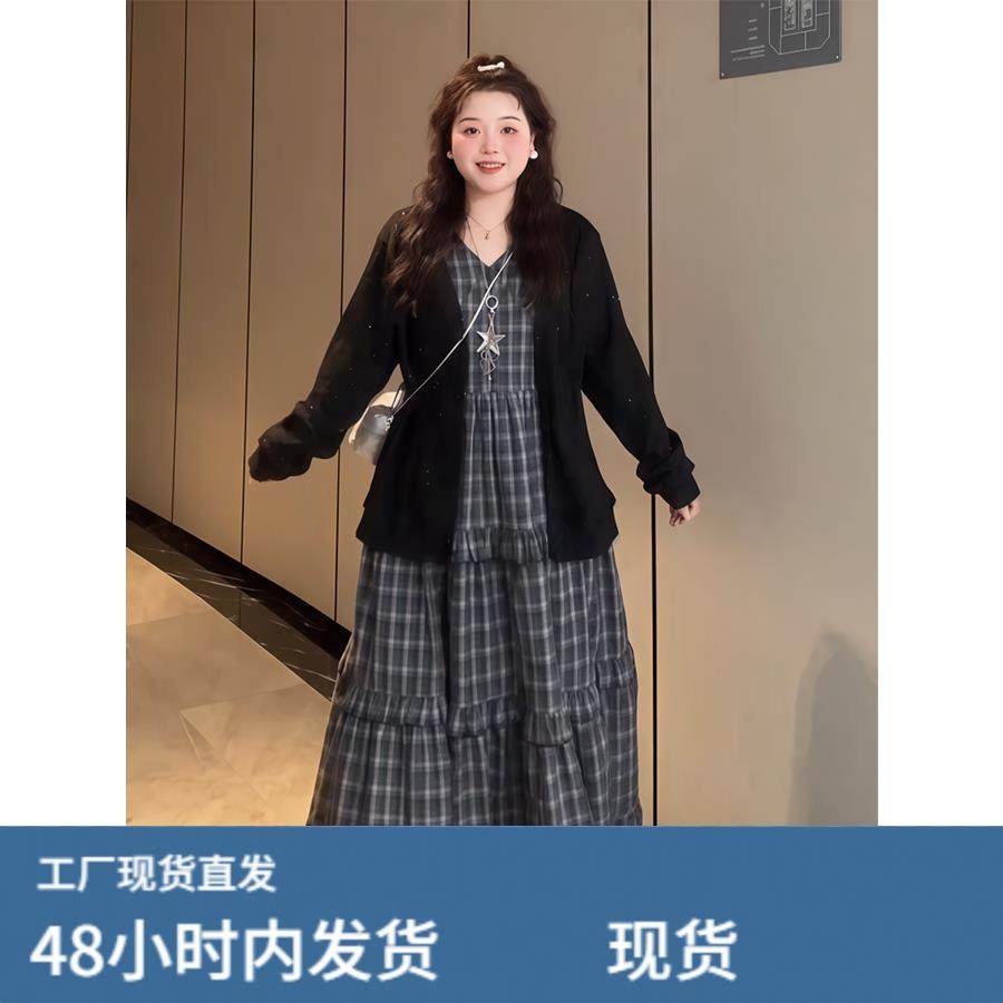 大码胖MM秋季韩版学院风复古v领格纹吊带连衣裙黑色软糯毛衣套装