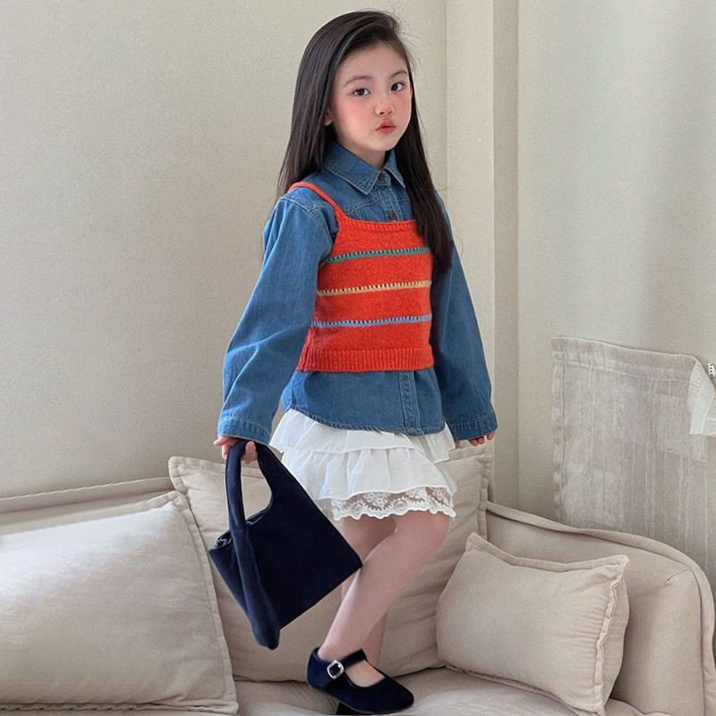 女童春秋季套装新款洋气小童韩版牛仔打底吊带毛衣半身裙三件套潮