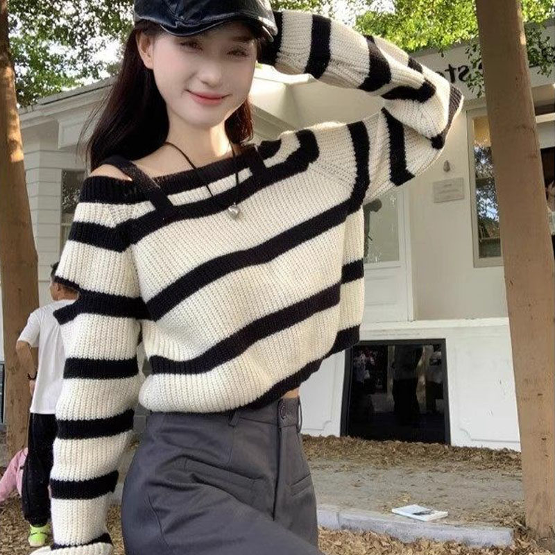 性感甜辣妹吊带长袖针织衫女春秋新款韩版设计感露肩条纹套头毛衣