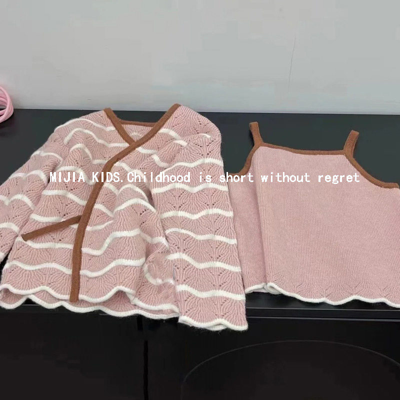 女童时髦针织套装2025秋冬新款韩版儿童洋气条纹毛衣外套+吊带裙
