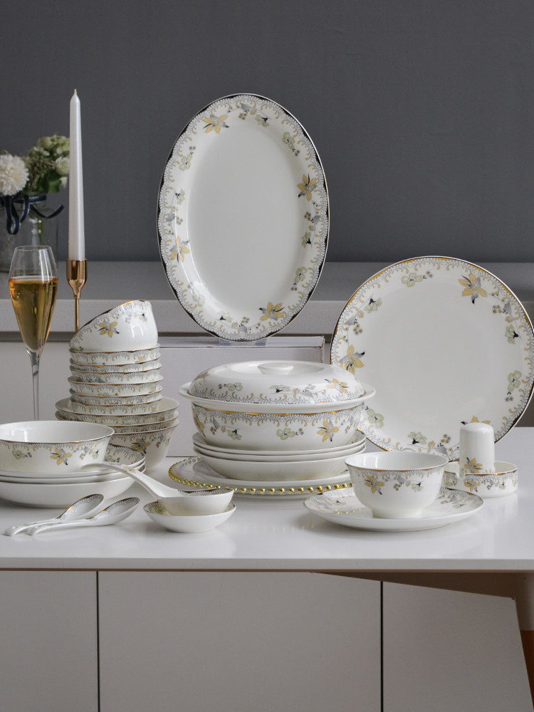 古杰士步步高升轻奢骨瓷碗碟餐具套装乔迁结婚礼高档中式碗盘组合