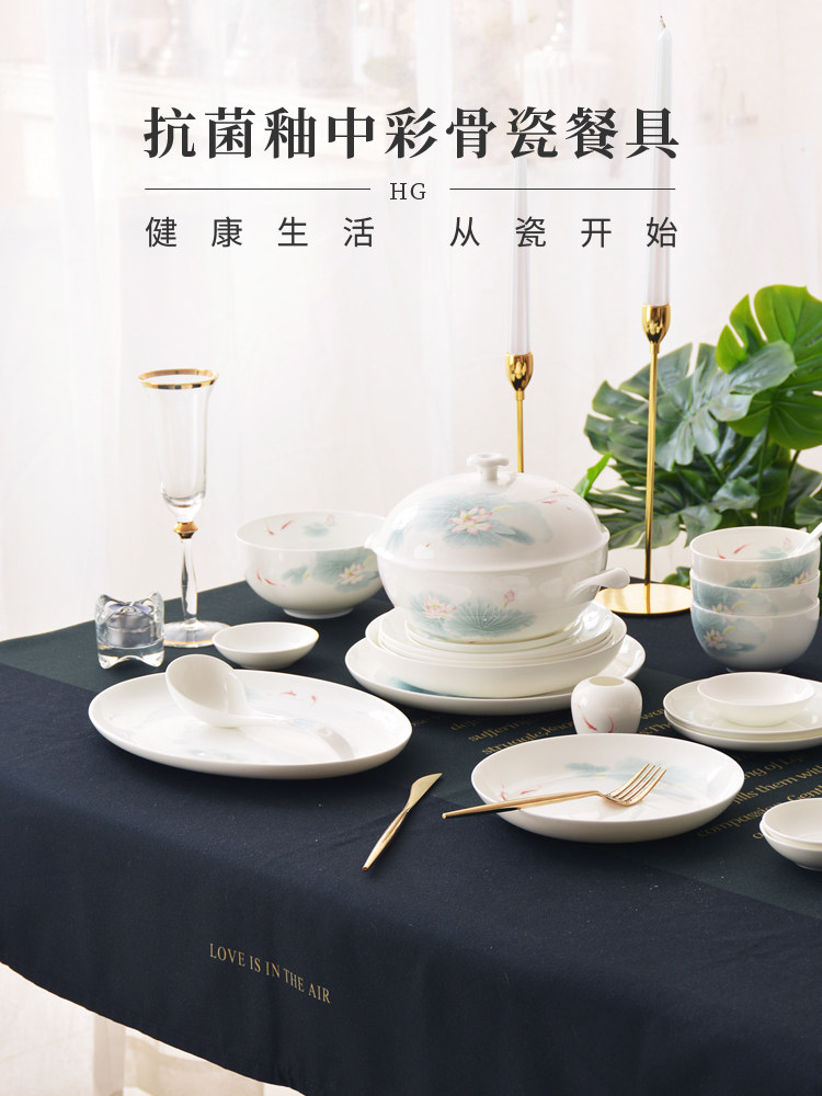 景德镇骨瓷碗碟餐具套装家用国风中式荷花酒店金边碗盘礼品装碗筷