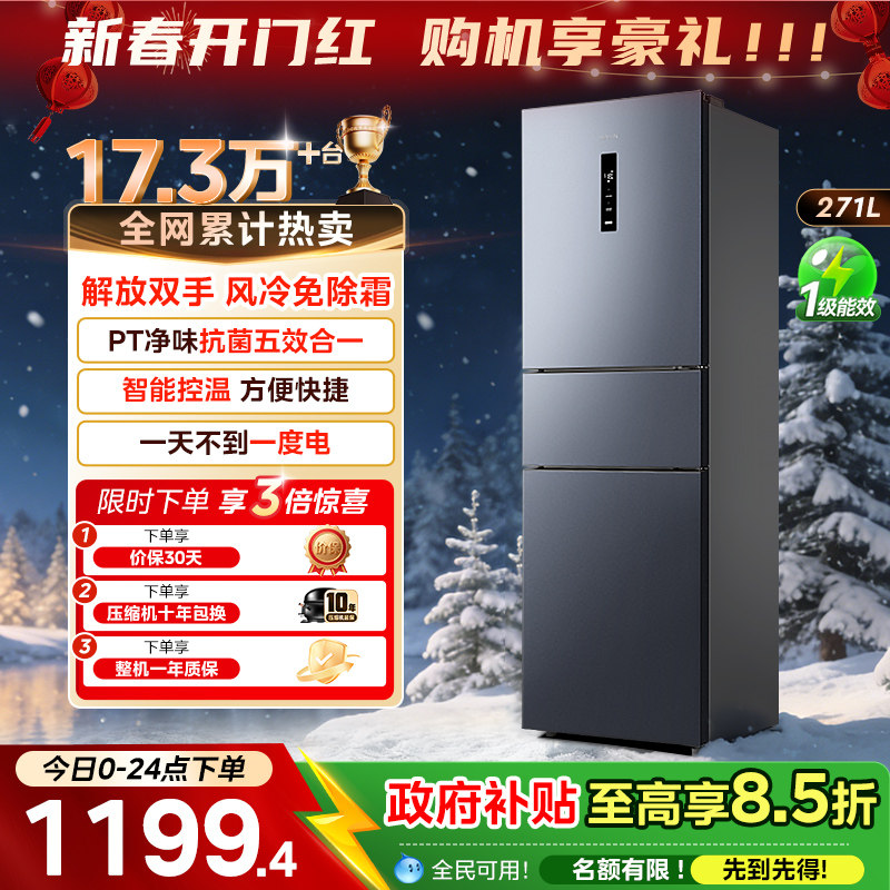 美的283三开门电冰箱一级能效家用变频风冷无霜小型超薄官方租房