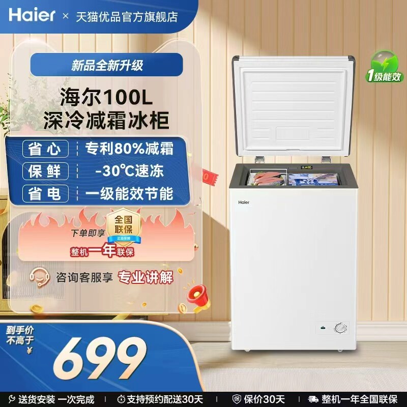 【热销】海尔100L冰柜商用小型家用冰箱一级能效冷藏减霜节能冷柜