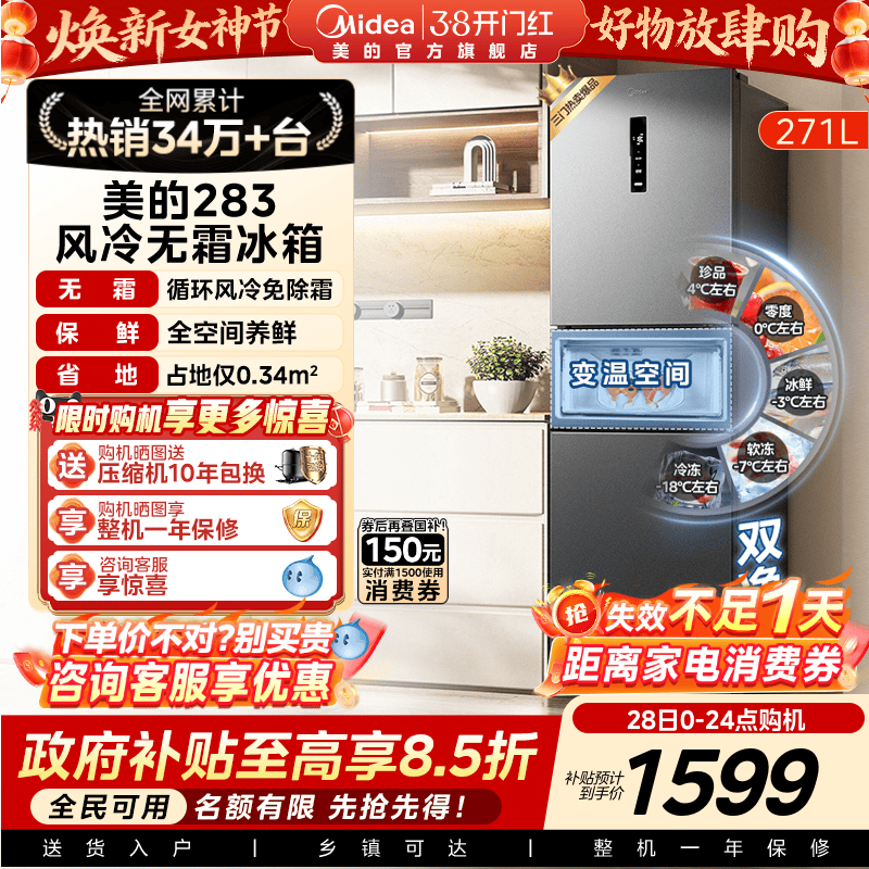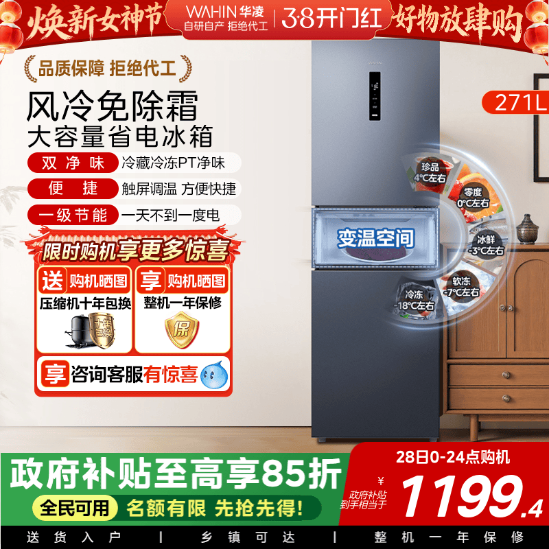 美的出品华凌282三开门冰箱家用小型变频一级节能风冷无霜租房