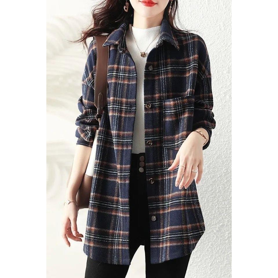 格子衬衫女外套中长款长袖2025新款春秋宽松韩版加厚复古休闲衬衣