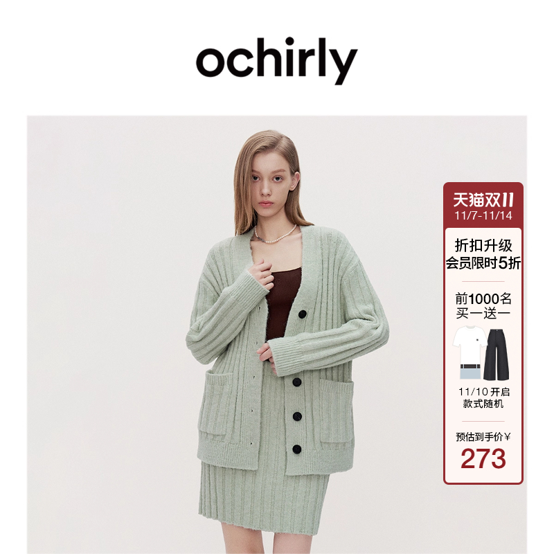 OCHIRLY欧时力 绒感针织外套开衫女V领慵懒毛衣高级秋冬新品