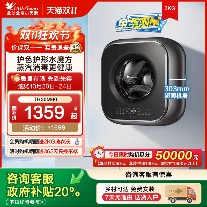 小天鹅3kg迷你洗衣机宝宝母婴除菌儿童婴儿小型全自动壁挂TG30M60