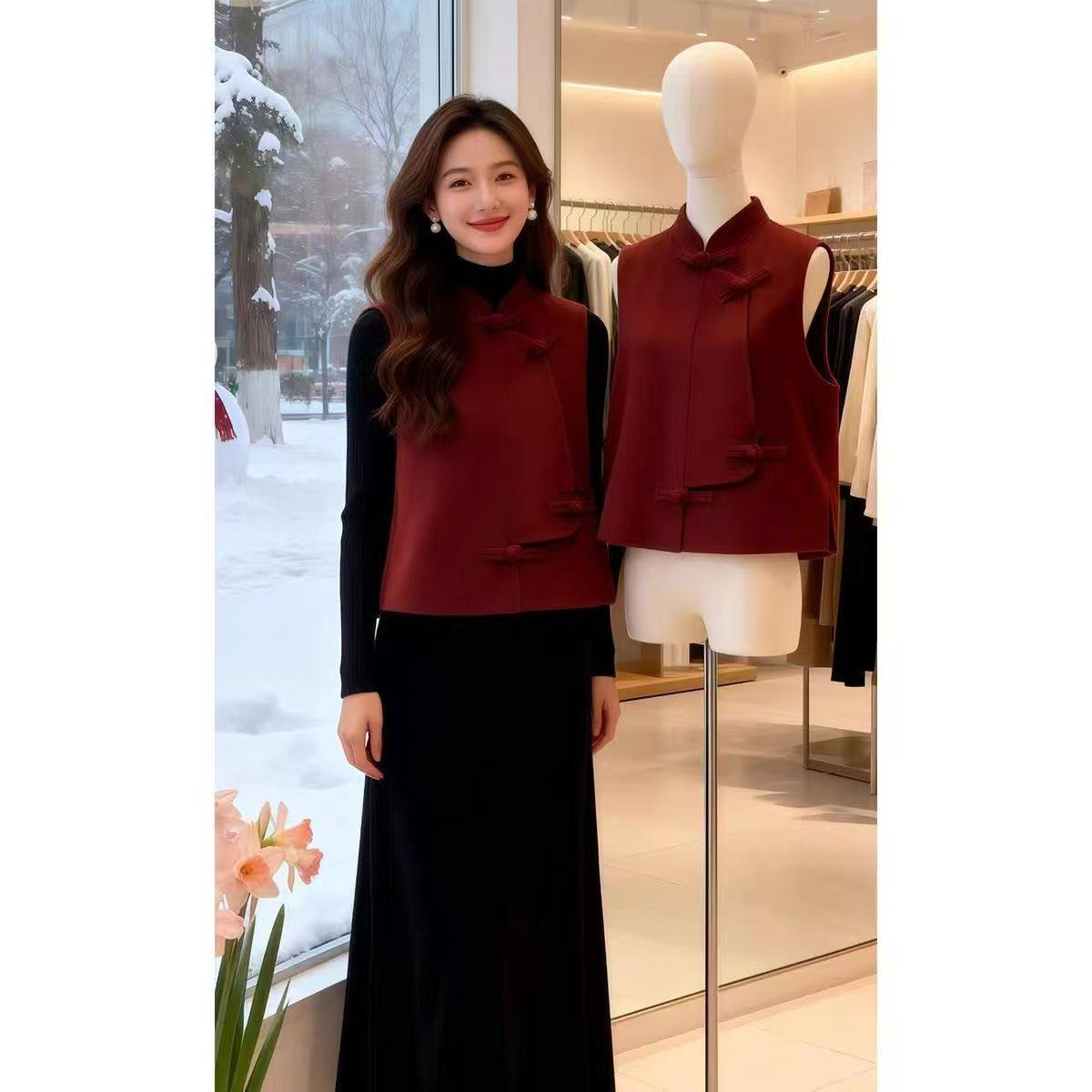 唐装新中式国风立领盘扣马甲女本命年红色气质轻奢过年红背心外套