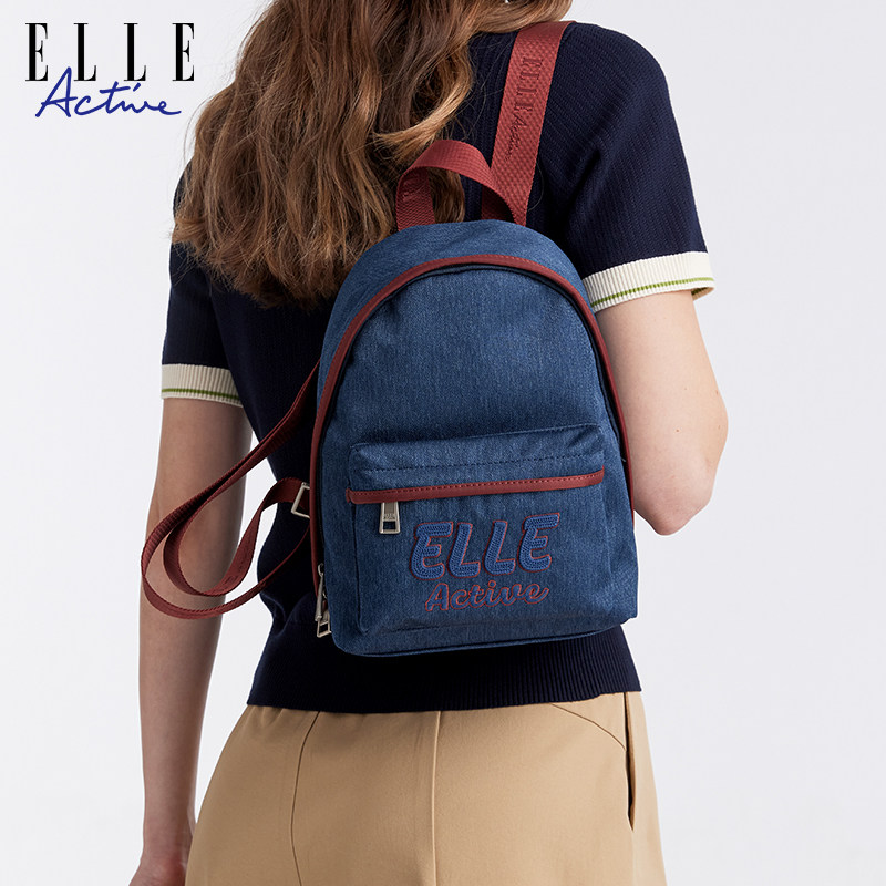 ELLE Active女包仿牛仔双肩包质感刺绣背包旅游轻便包包时尚百搭