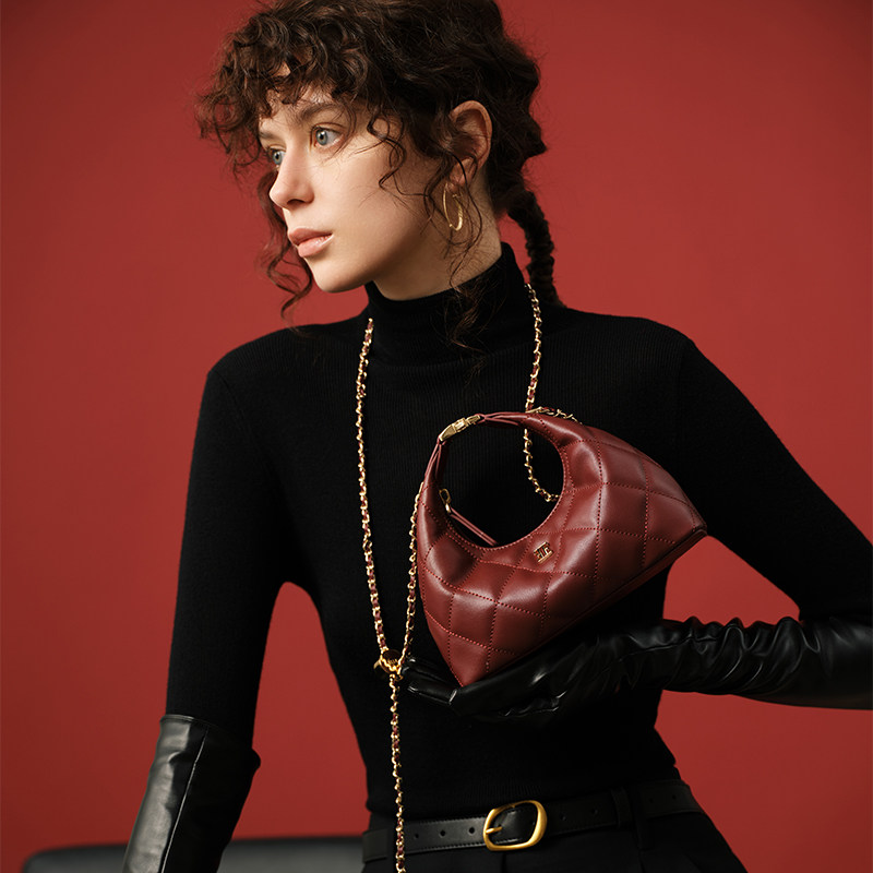 ELLE女包红色菱格纹手提包牛皮链条斜挎包高级感月牙包豌豆斜挎包