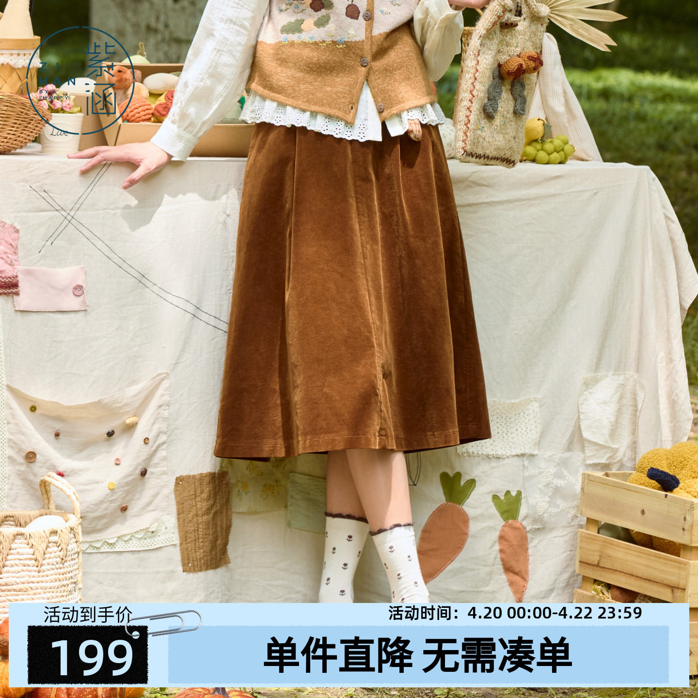 pusumede 榛果暖秋 灯芯绒半身裙女设计感刺绣高腰气质a字短裙