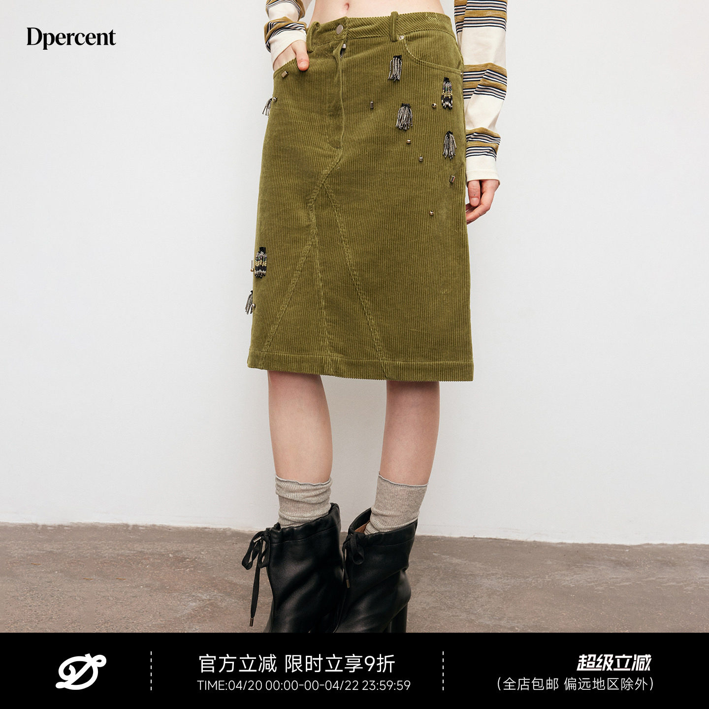 Dpercent丨灯芯绒苔藓绿手工钉珠装饰拼接A字收腰后开衩半身裙